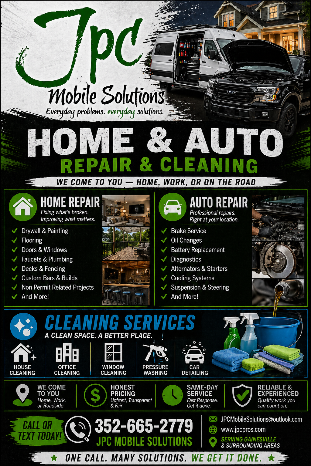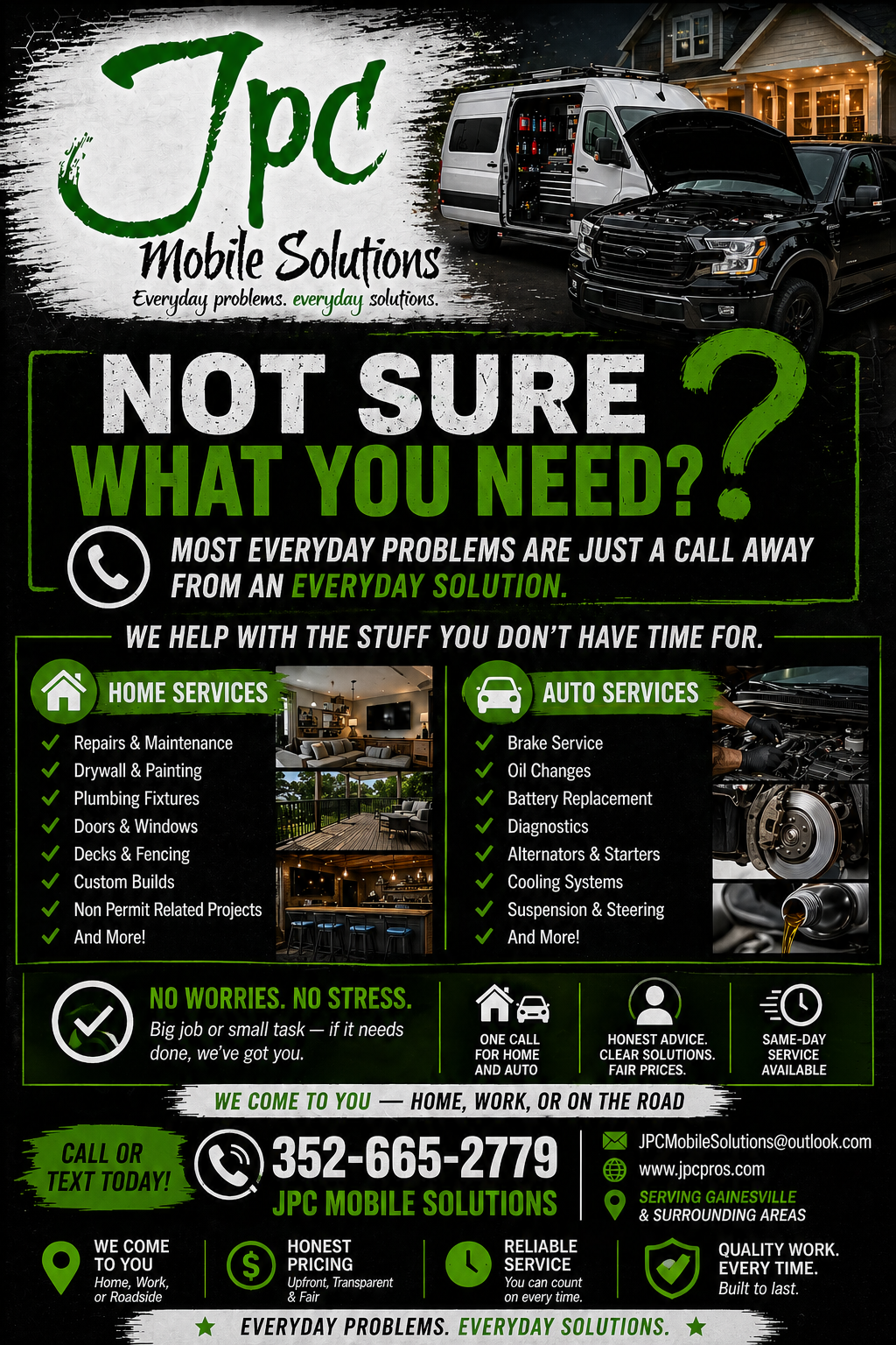 Here at JPC Mobile Solutions, we strive for excellence, integrity, quality, and passion in everything we do. We are a team of professionals that range from mechanics, car audio, carpenters, and custom crafts. From needing a new deck, floors, your car is making a weird noise, and most other everyday problems. Here at JPC we have over 50 years of combined experience in the different fields to assist.